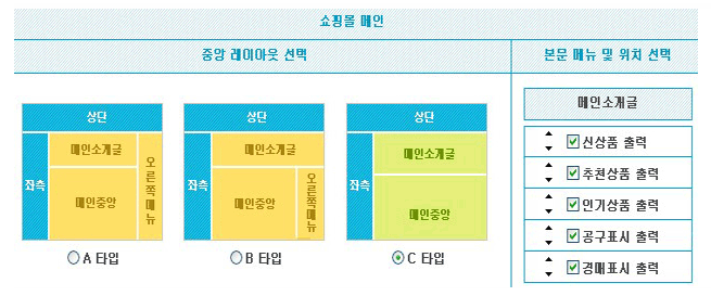 ¼îÇθô ·¹À̾ƿô ¼³Á¤ 1.¼îÇθô ¸ÞÀÎ Áß¾Ó ·¹À̾ƿô A,B,C ŸÀÔÀ» ¼±ÅÃÇÏ¿© »ç¿ëÇÒ ¼ö ÀÖ½À´Ï´Ù. 2.¼îÇθô ¸ÞÀÎ º»¹®ÀÇ °¢ ¸Þ´ºÃâ·Â ¿©ºÎ ¹× À§Ä¡¸¦ Á¶ÀýÇÒ ¼ö ÀÖ½À´Ï´Ù. |