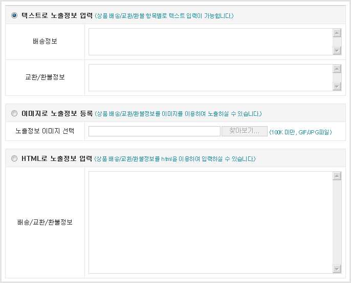 • - ¹è¼Û/±³È¯/ȯºÒÁ¤º¸¸¦ ÅØ½ºÆ®, À̹ÌÁö, HTML¸ðµå µî·Ï Áß ÇÑ °¡Áö ŸÀÔÀ¸·Î ÁöÁ¤Çؼ­ µî·Ï°¡´ÉÇÕ´Ï´Ù.